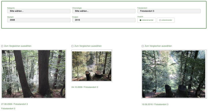 Das Fototool erlaub es, alle in den Chronologien erfassten Bilder nach verschiedenen Kriterien zu filtern und anzuzeigen, damit die Entwicklung der Fläche über die Zeit möglichst einfach visualisiert werden kann. Es können entweder alle Bilder einer Kategorie, eines Chronologieeintrages, oder eines Fotostandortes angezeigt werden. Zudem können die gewünschten Bilder nach den Aufnahmejahren (Startjahr bis Endjahr) eingeschränkt und die Darstellung angepasst werden.