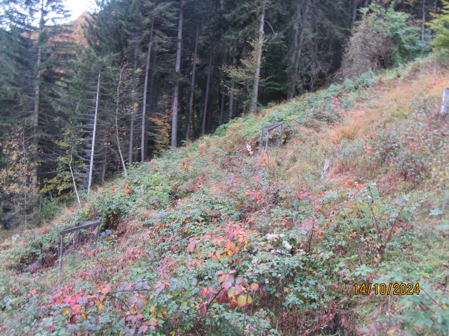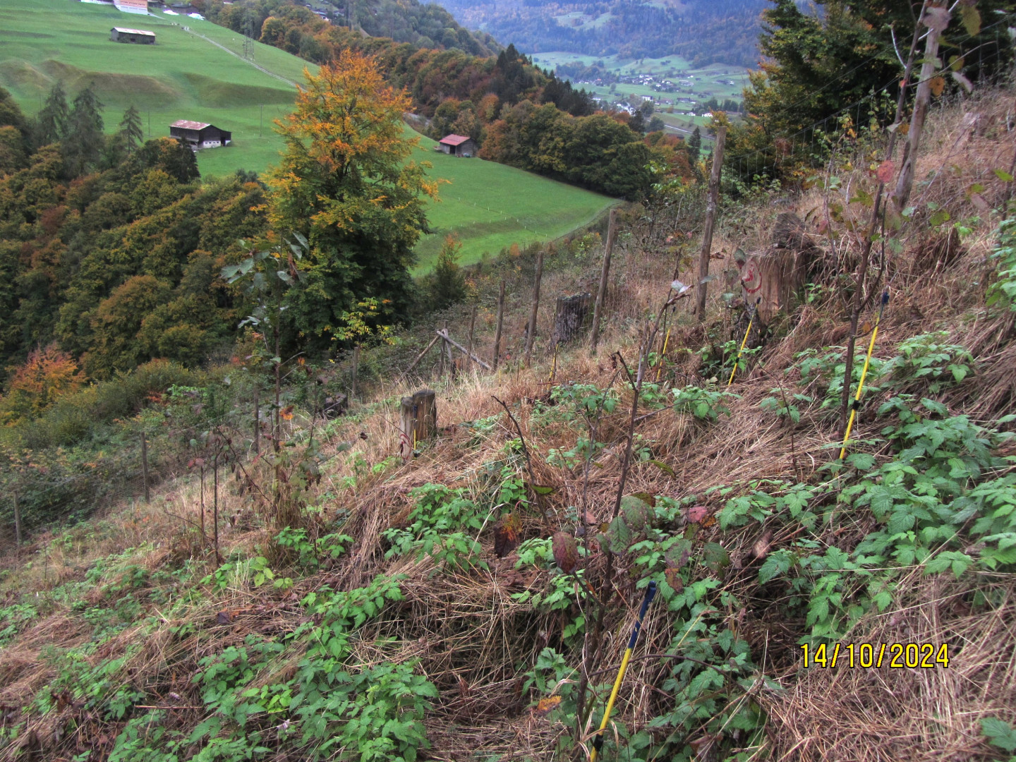 Ausserhalb der Zäune sind die Schürfflächen grossteils von Brommbeeren und Gras überwuchert. Es kommen erst spärlich einzelne Lichtbaumarten auf welche die Brommbeeren überragen. Die Fichten wildlinge um die Einzelschütze sind nur noch vereinzelt auffindbar, entweder überwucherto der nichtmehr vorhanden. In den Einzelschützen kommen die Douglasien gut auf, werden jährlich Ausgetrichtert.