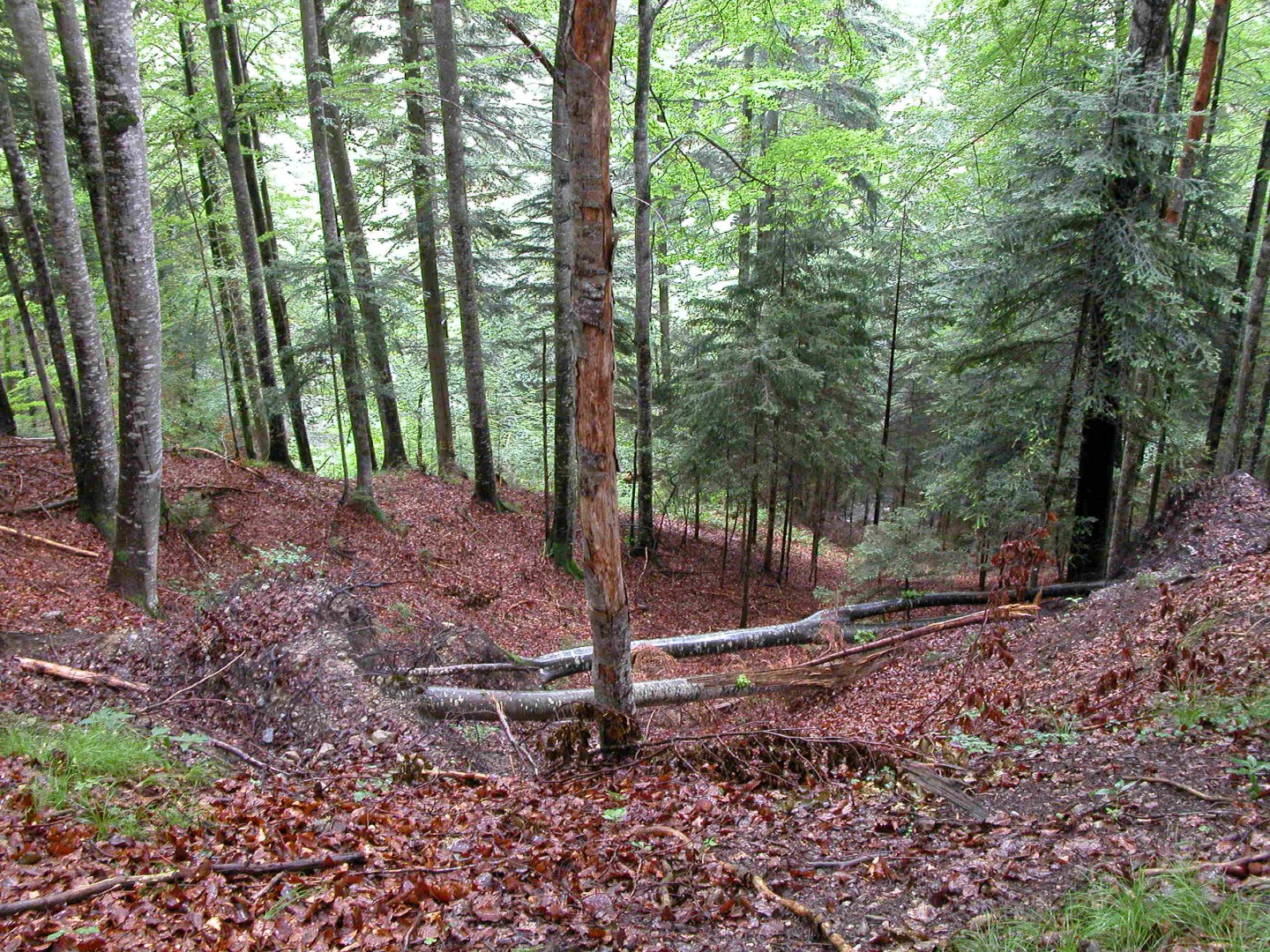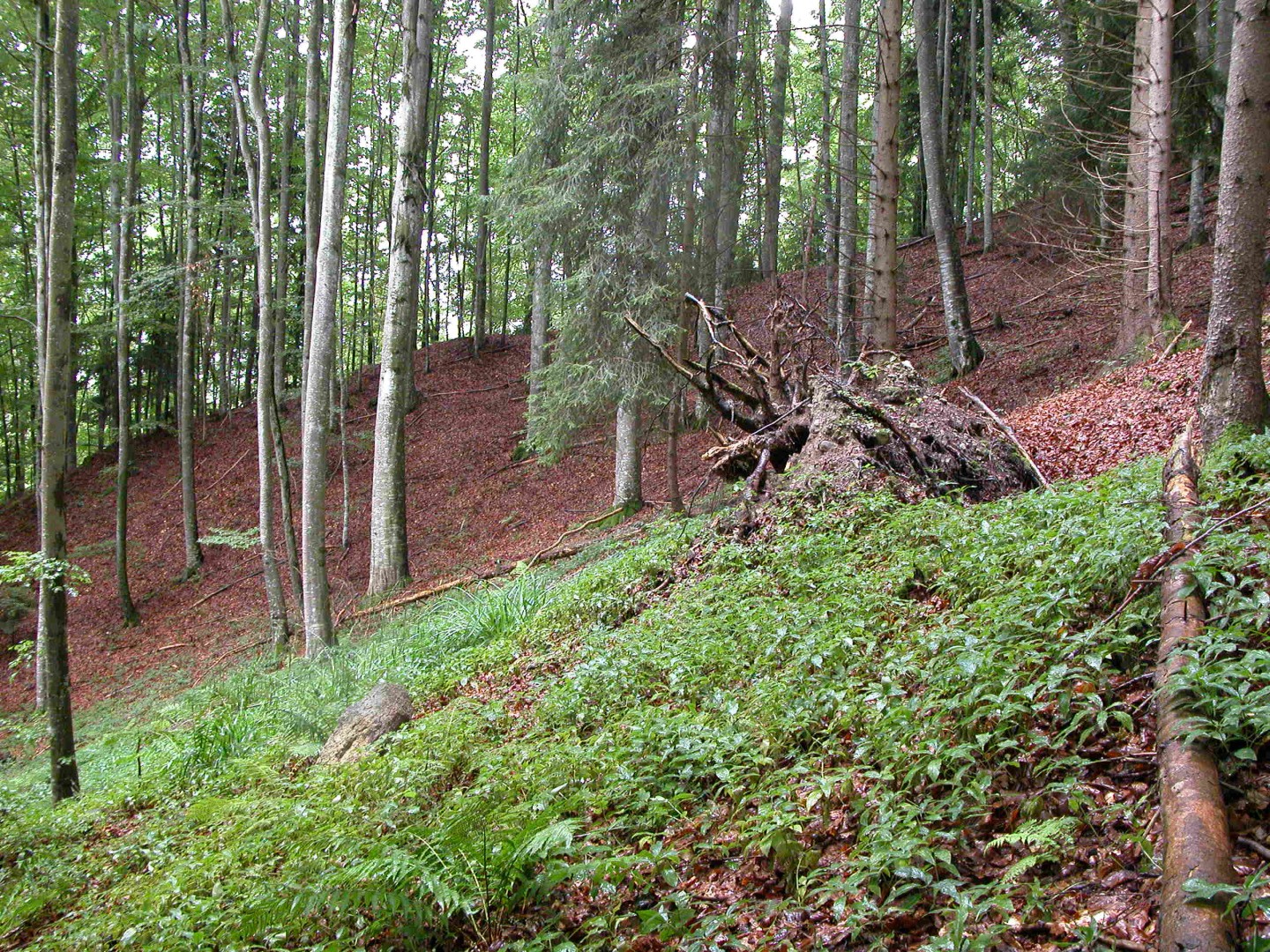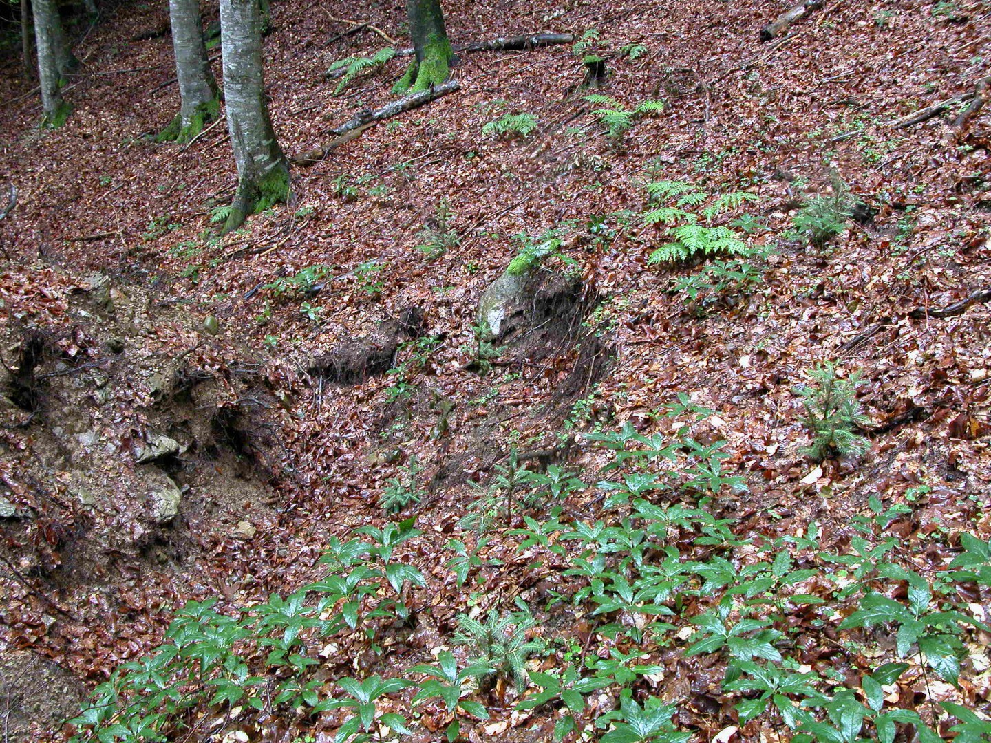Im Hang Richtung E 3 (Exp. NO) sind 5 Bu (Total 2 m3) geworfen worden