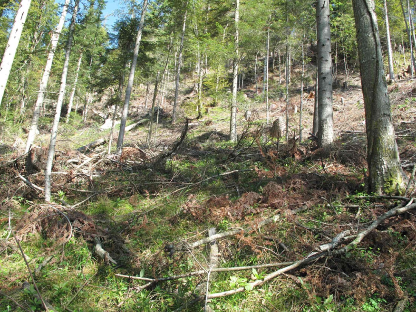 4 cellules de rajeunissement établi, composé d'épicéa, frêne, hêtre, érable, orme champêtre, saule, alisier blanc et sorbier des oiseleurs (le sapin est présent dans le recrû initial mais absent du recrû établi car abrouti)