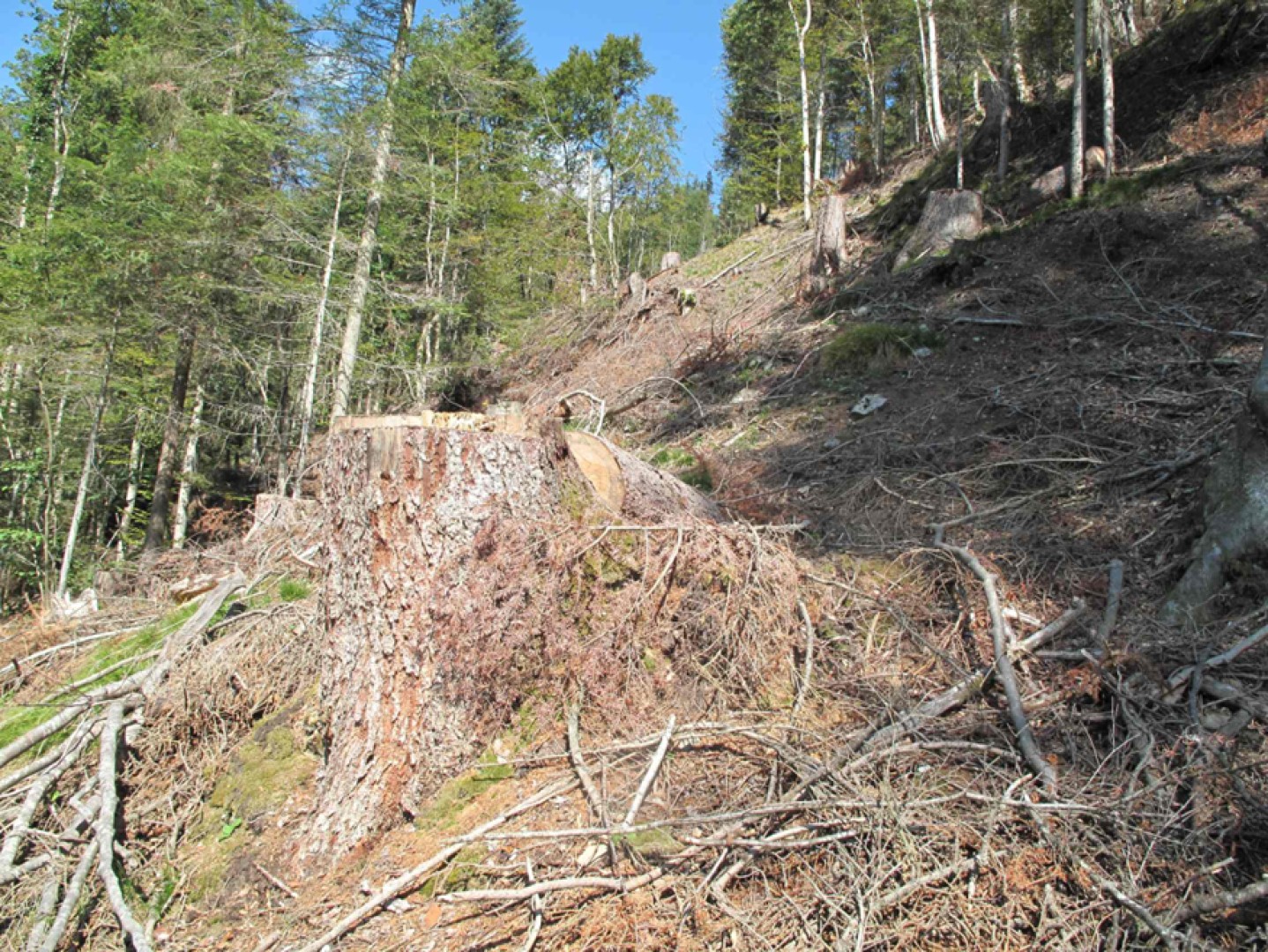 Etant donné les conditions hydrique et l'exposition, il y a beaucoup de résineux sains dans le rajeunissement. Par conséquent, l'évolution du mélange à long terme est à surveiller pour éviter qu'il n'y ait trop de résineux dans le mélange. De plus, les couronnes des feuillus doivent pouvoir se développer suffisamment pour garantir la stabilité du peuplement face au danger de glissement.