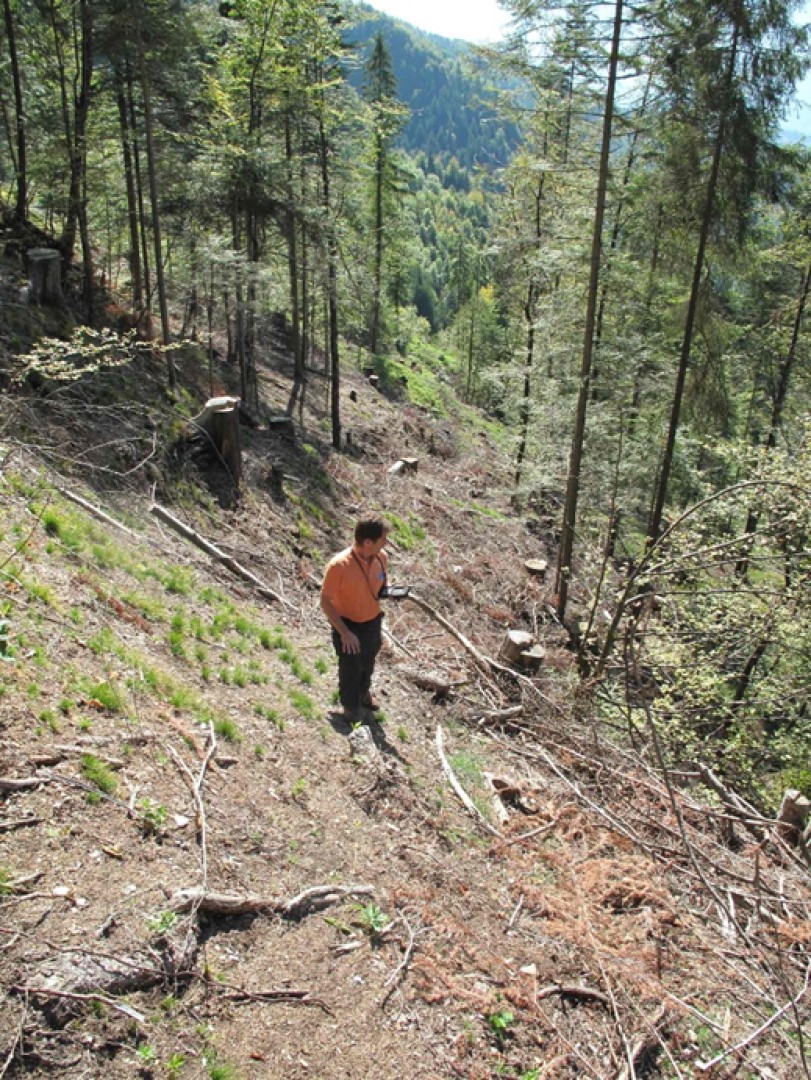 Surface exploitée en 2008 au câble-grue, création de trouées. Bois exploités, surtout épicéas! A fait l'objet de soins depuis 2008