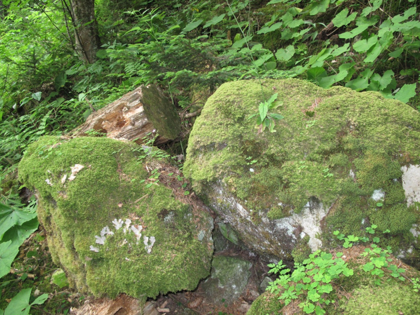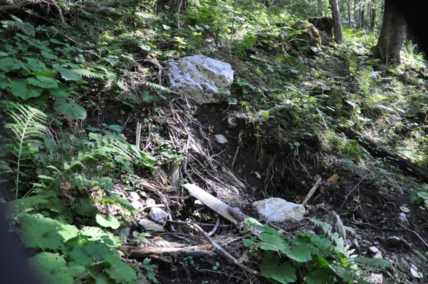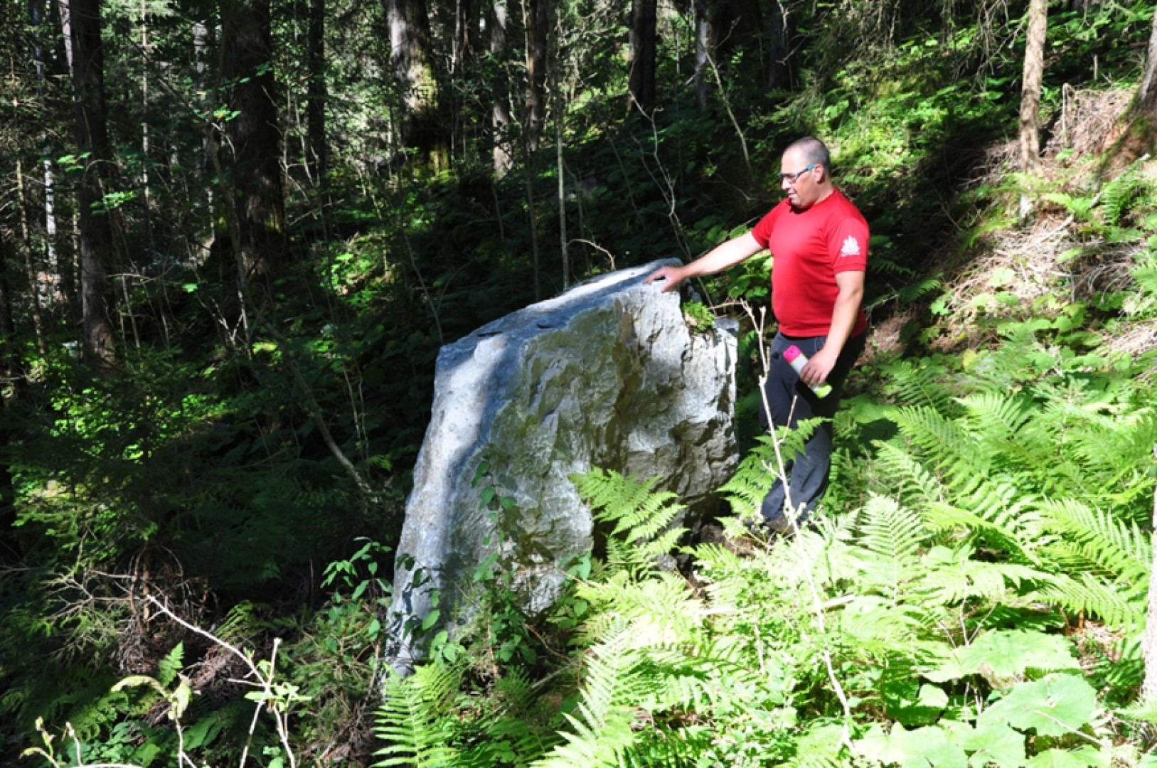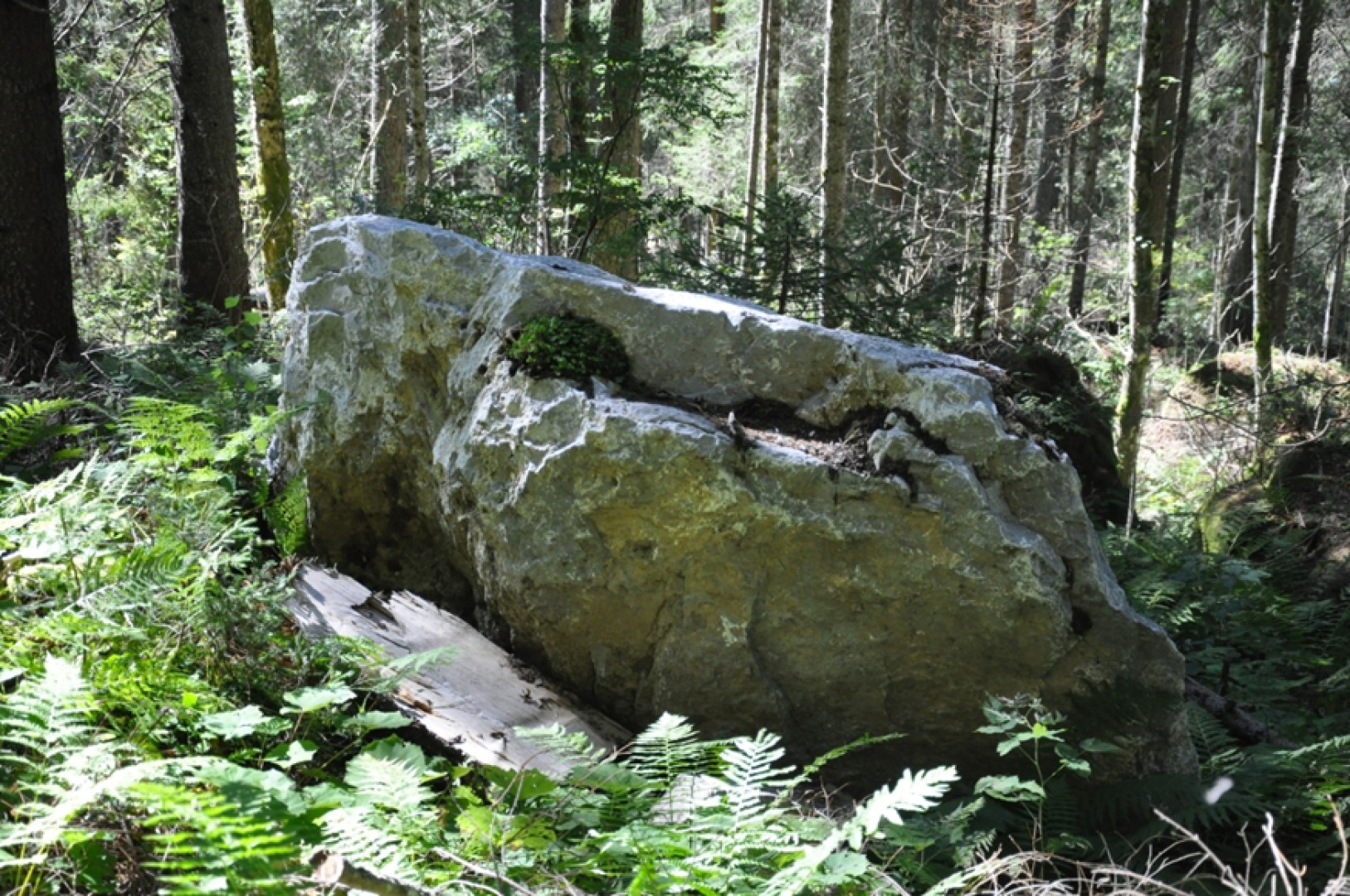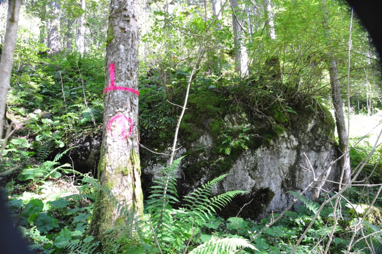 2014 : Coupe sur env. 1/3 de la placette. Pendant la coupe, descente d'un très gros bloc (env 10 m3, mais hors placette) . On trouve dans la placette des gros blocs descendus récemment. (Ces dernières années). Le peuplement en place ne permet qu'à 25-50% d'arrêter ces blocs. On trouve un épicéa coupé net à quelques mètres de haut. Le bloc a été arrêté. Pour les plus petits blocs, le peuplement est bien adapté. (Voir les analyses outil chutes de pierre).