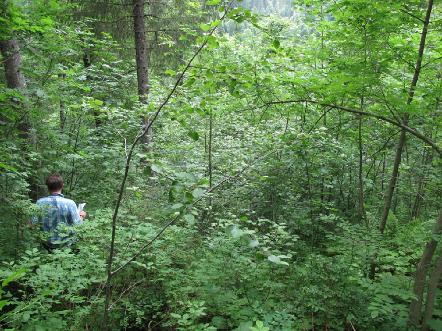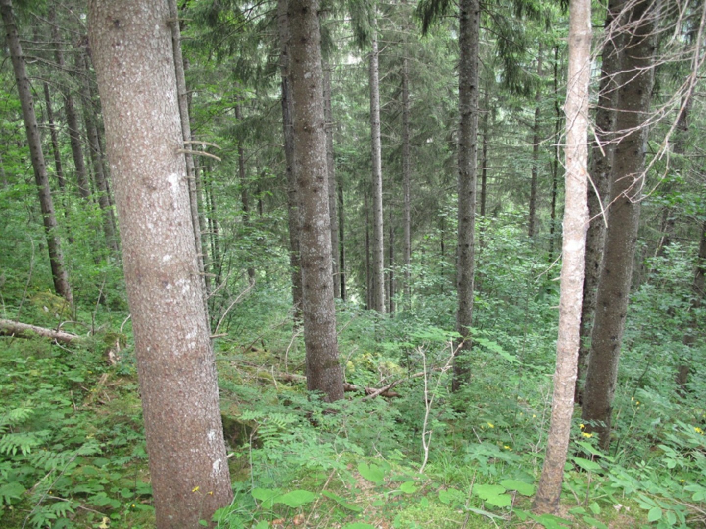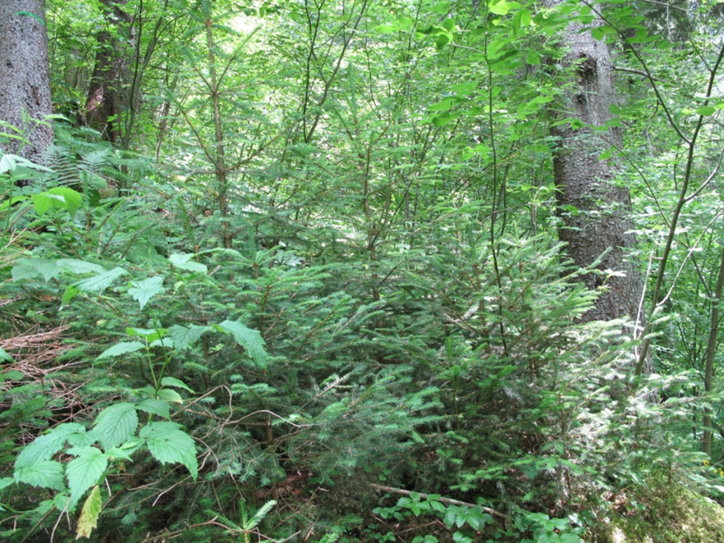 Le mélange est composé d'une majorité d'érable (60%), l'épicéa ne représente plus que 20% du peuplement, les frênes 3-5% et les mélèze 1%. Une bonne diversité d'autres feuillus est apparue (aulne blanc, merisier, sorbier des oiseleurs, merisier, saule)