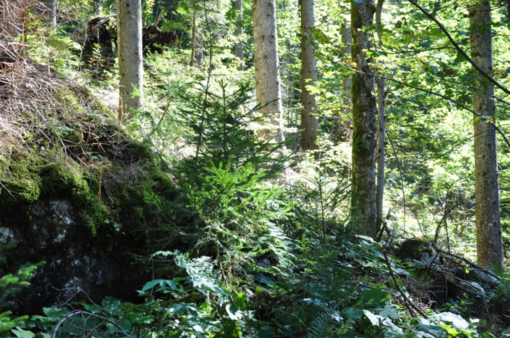 Le recrû n'est pas présent en suffisance et le raj établi est au stade du fourré et bien réparti sur la surface (deg. de recouvrement: 40%), composé de frêne, épicéa, érable, sapin