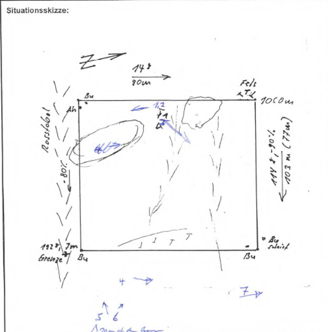 2 - 3 ovale Öffnungen im Kronendach, in Hangfallinie < 20m (Stämme beim Fällen evtl. sichern), Einzelne Bäume nur gesichert liegen lassen (7 der 18 angezeichneten Bäume bleiben liegen)