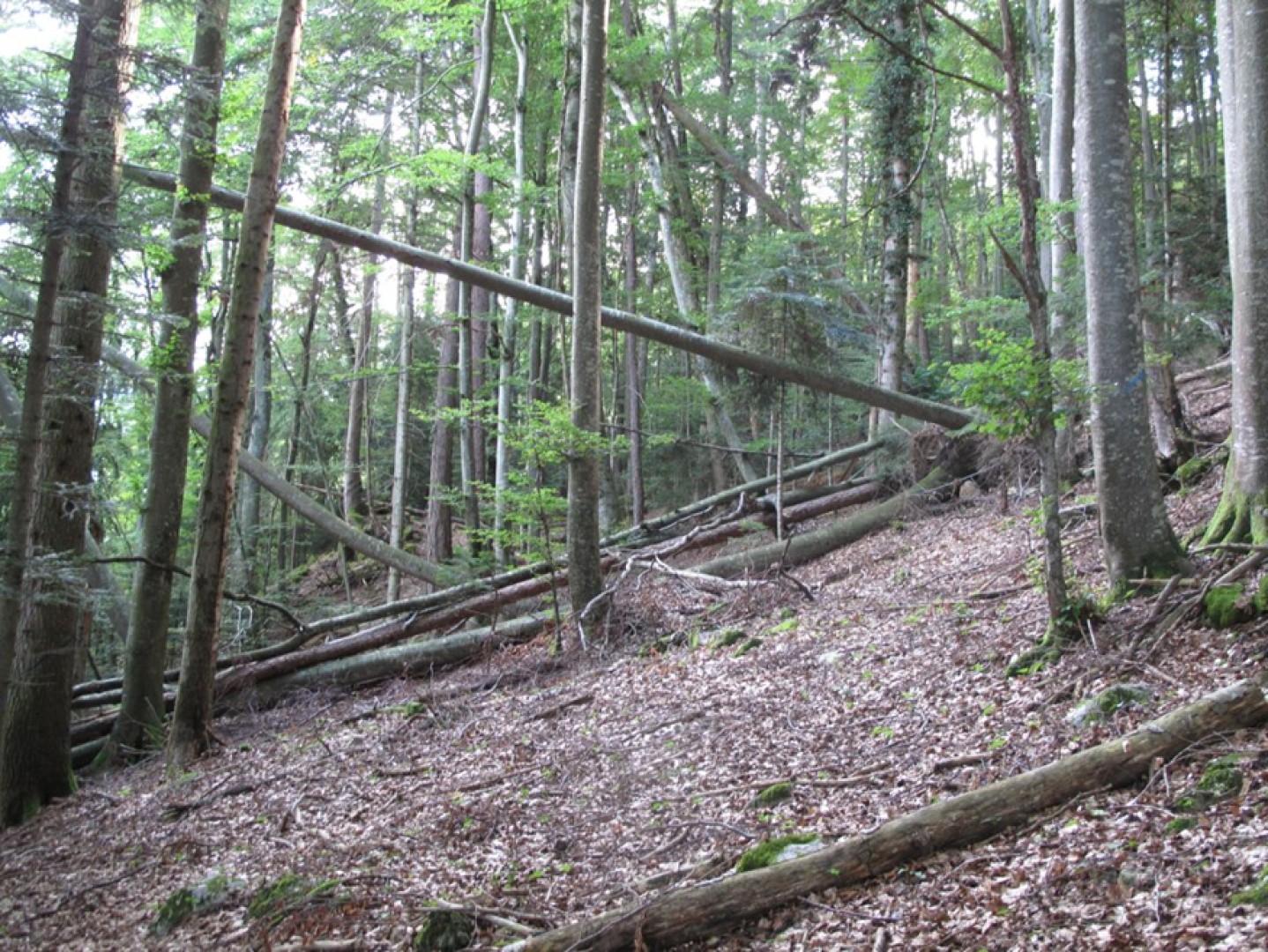 2014 : Coupe le long de la ligne de chemin de fer. Depuis la rupture de pente, coupe forte pour sécuriser la voie. Elimination des arbres penchés, prélèvement de 50% environ.