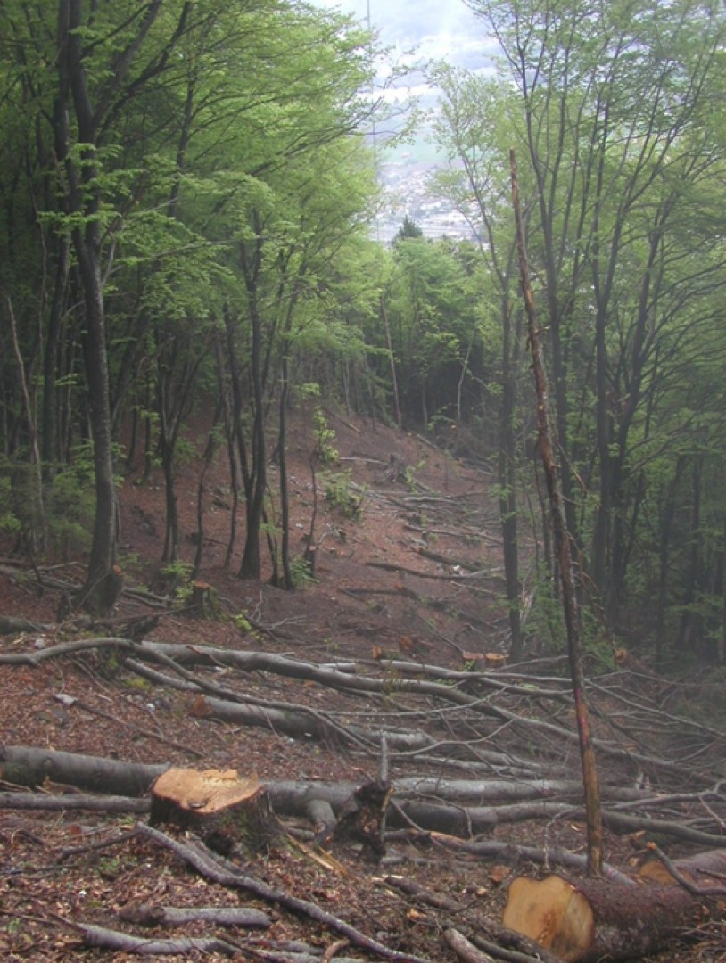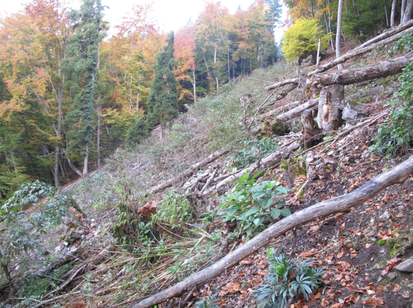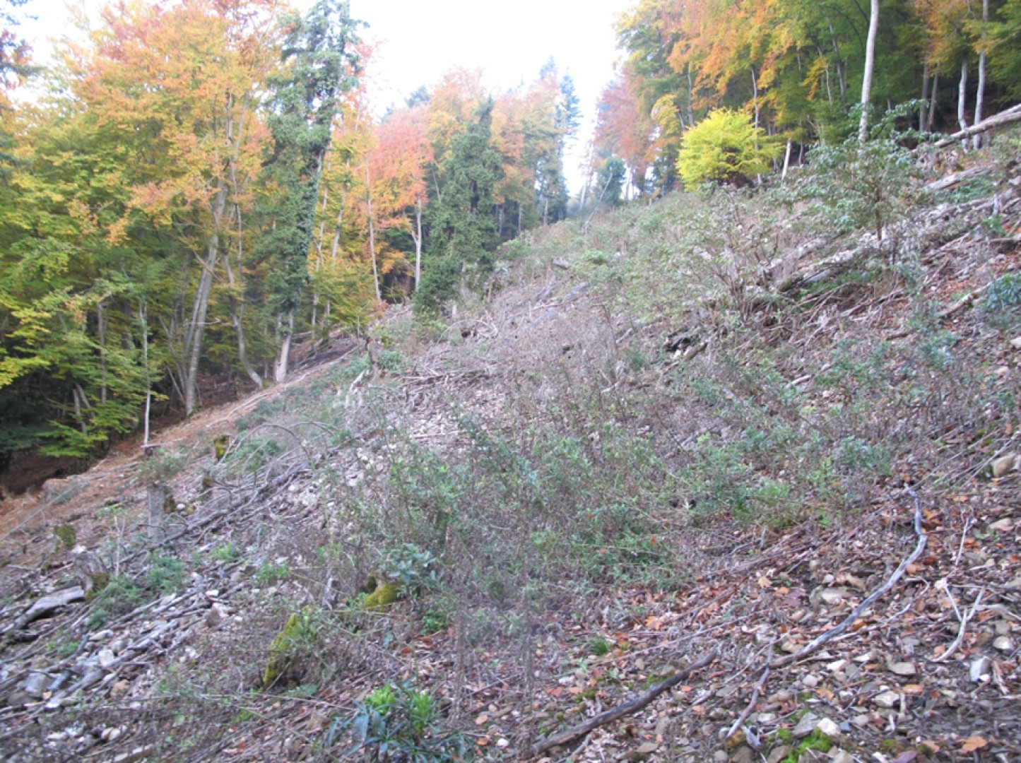 Le lit de germination est totalement absent dans une bonne partie de la trouée de ligne de câble. La pression du gibier est forte sur le rajeunissement de feuillus.