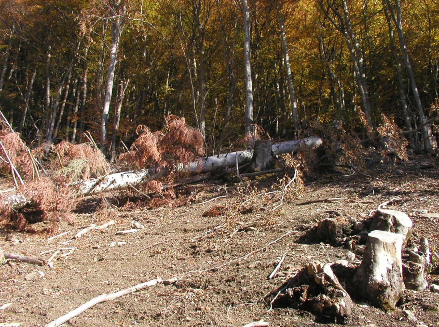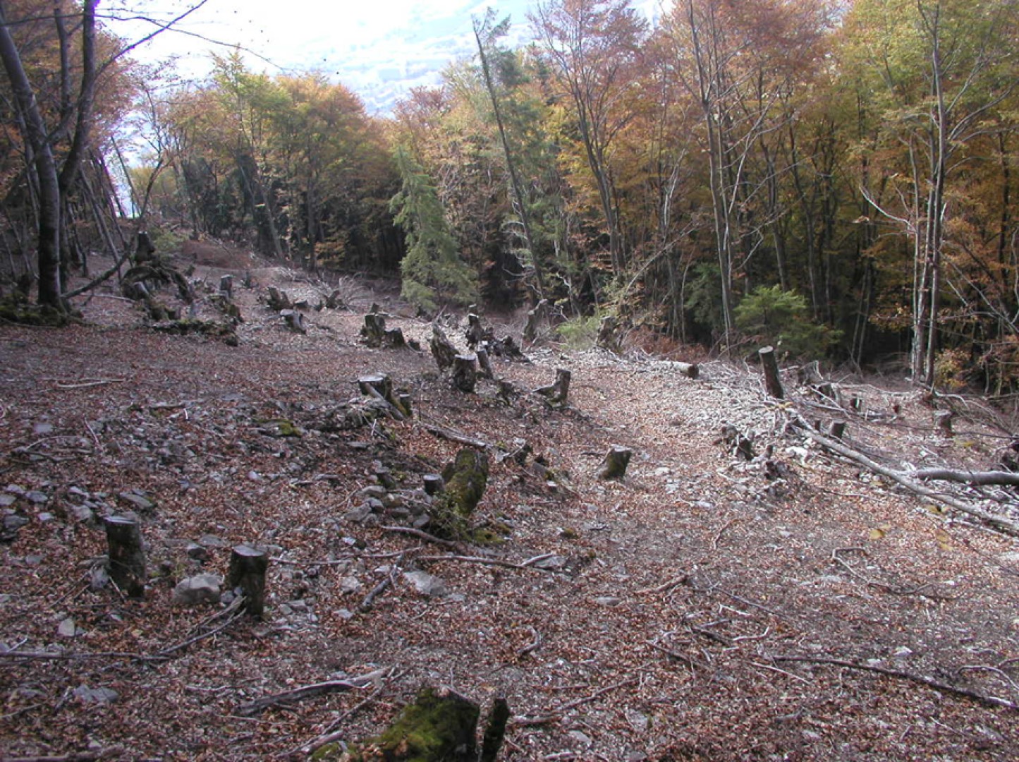 En bas de la surface, traitement en futaie, dernières exploitations fin des années 1990.