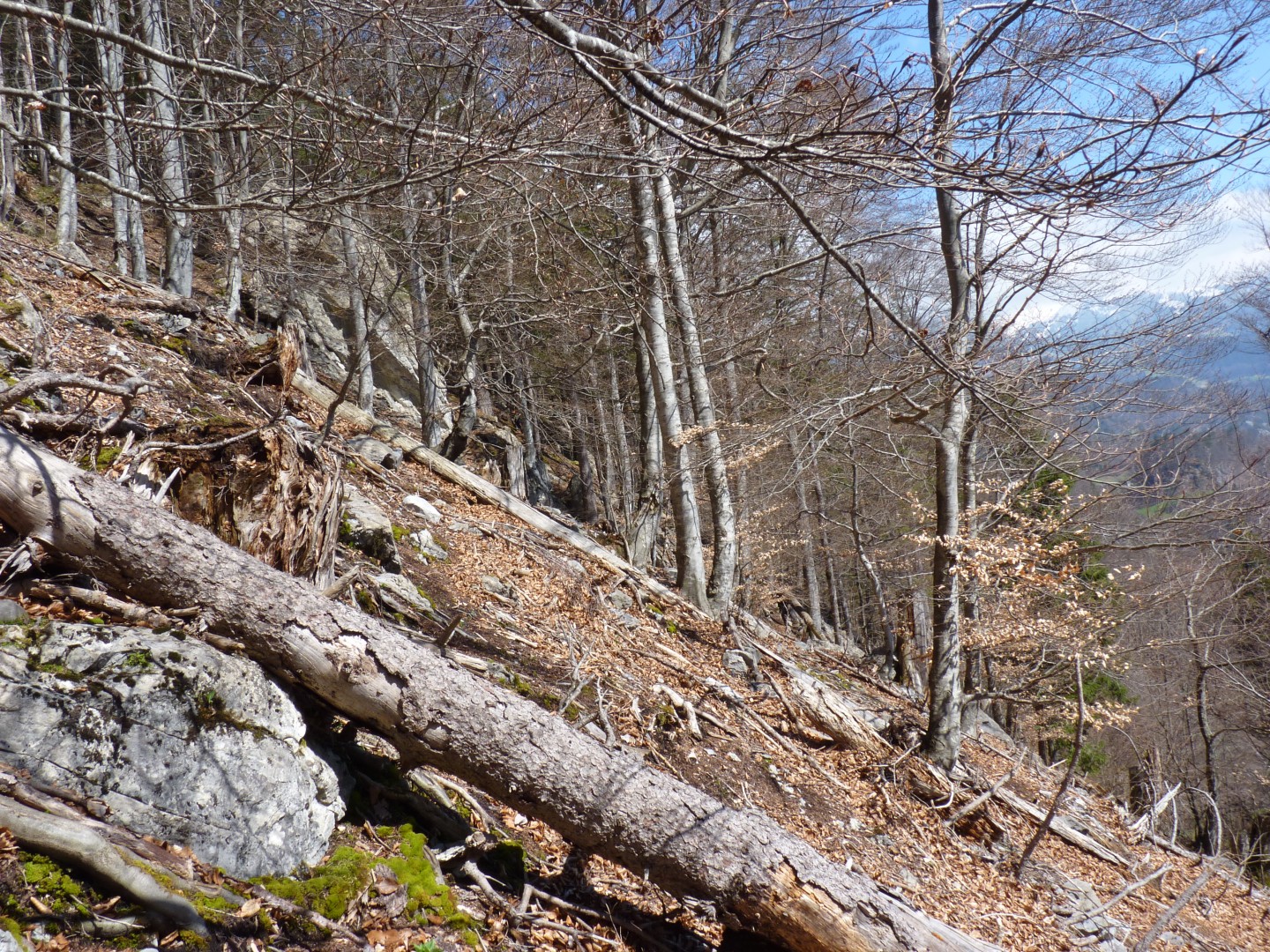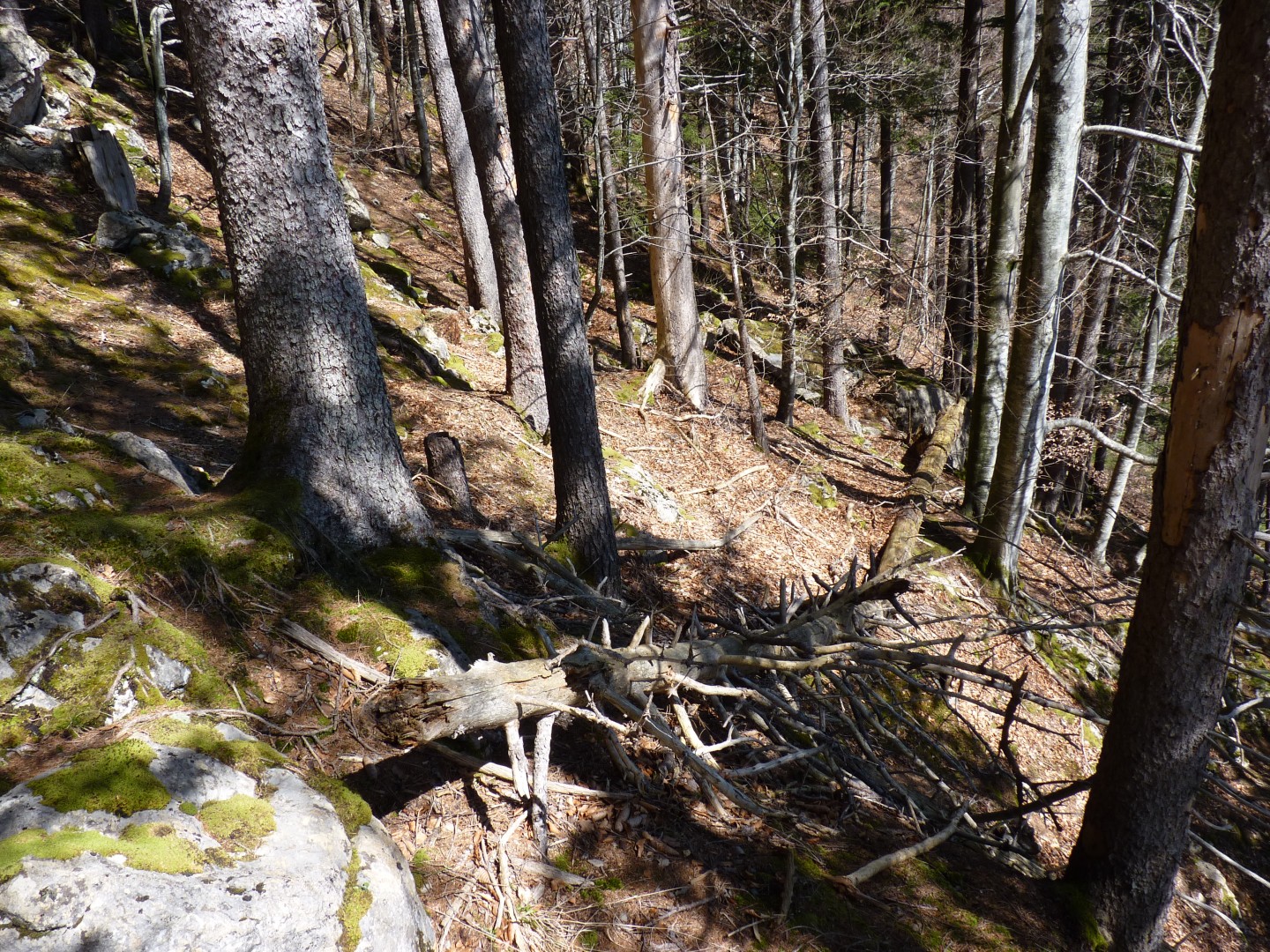 Dicke Querbäume erfüllen Funktion bezüglich Steinschlag noch, dünne bereits stark zerfallen Steinschlag hat keine negative Wirkung auf Verjüngung, fehlt eher wegen starkem Eingriff.