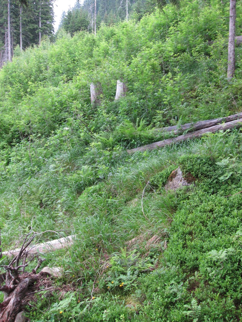 Etablierung der Fichten-Verjüngung erfolgt bevorzugt unterhalb von alten Stöcken, erhöhten Lagen, im Birken- oder Vogelbeervorwald. In den Hochstauden braucht die Verjüngung sehr viel Zeit.