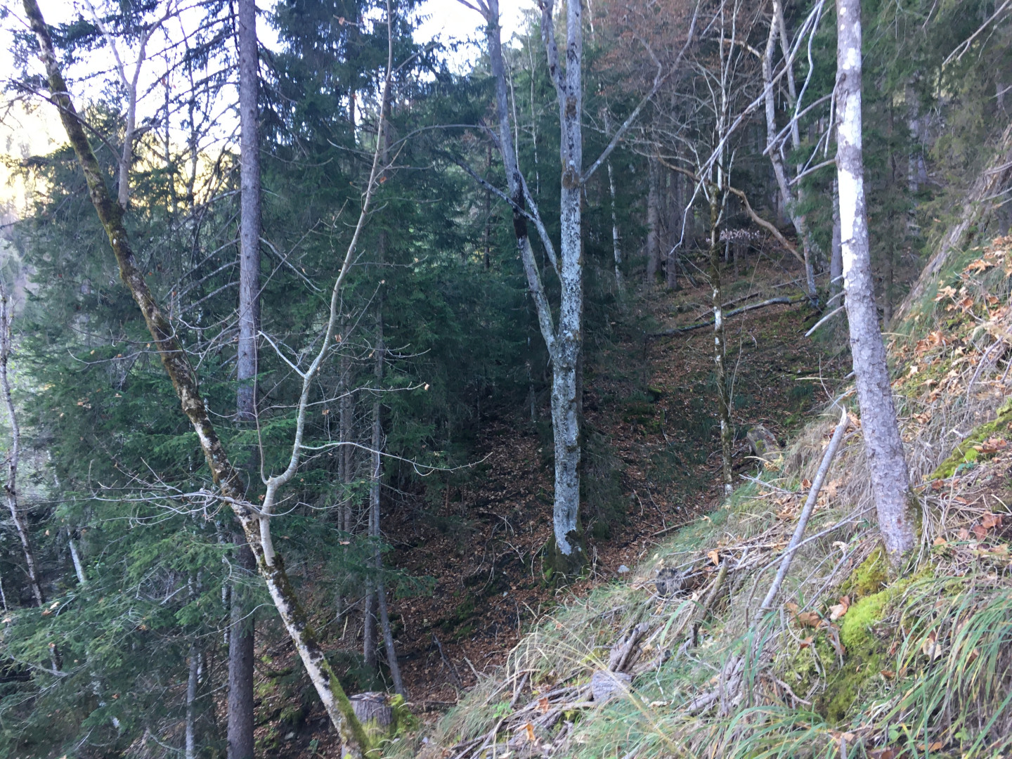 Die Bewaldung verhindert oder reduziert die flachgründigen Rutschungen. Die Stabilisierung des Hangs wiederum führt zu einem verstärkten Aufkommen der Verjüngung. Der Wildeinfluss auf die zukünftige Baumartenzusammensetzung ist gross. Die Tanne und der Bergahorn könnten hier bei niedrigerem Wilddruck gut aufkommen.