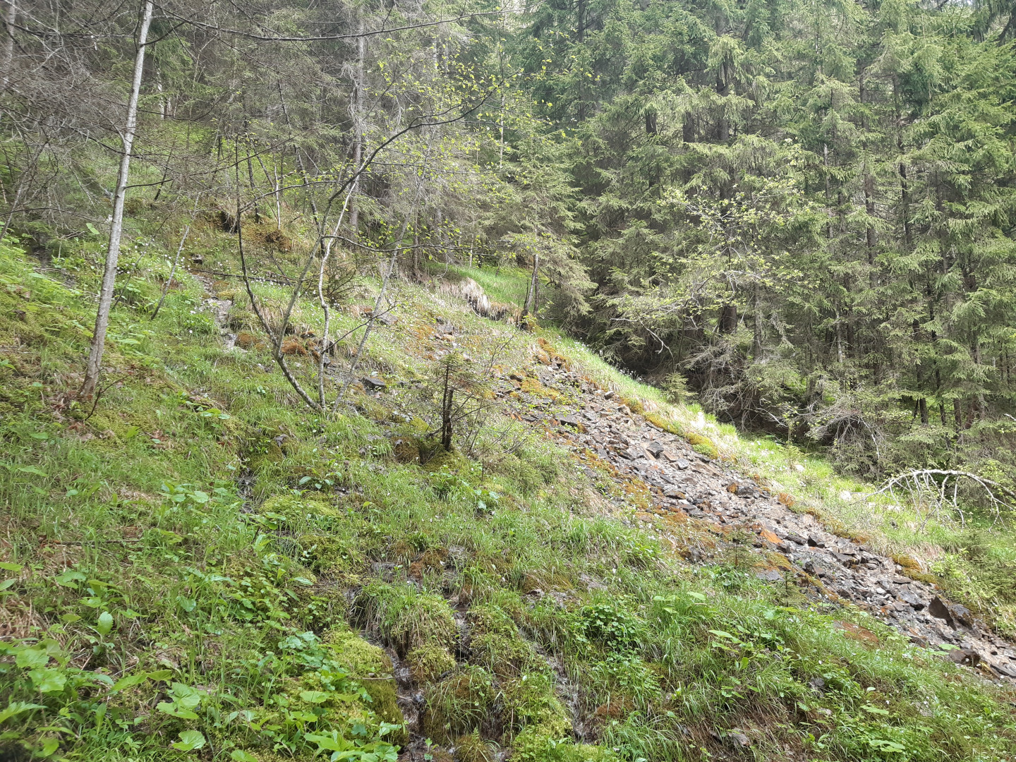 - Natürliche Verjüngung in der Rutschungsfläche ist erstaunlich schlecht aufgekommen (Voraussetzungen scheinen eigentlich gut (gewesen) zu sein -> viel Licht & keine Vegetationskonkurrenz).
