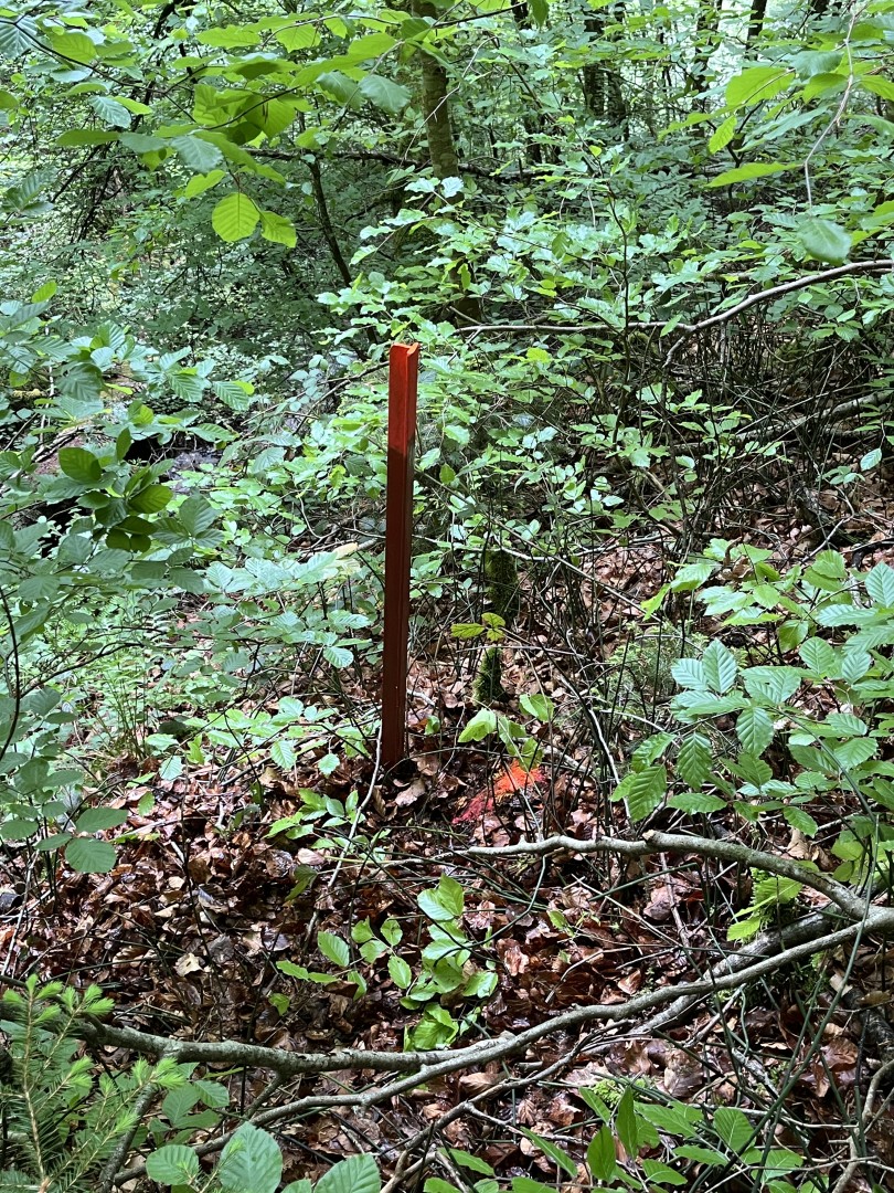 2011 : Mise en place de la placette. On trouve dàjà du rajeunissement de hêtre établi avec qq tiges de chêne et d'épicéa. Il faut maintenant assurer la stabilité du gaulis - bas-perchis pour qu'il puisse résister à une éventuelle neige lourde.