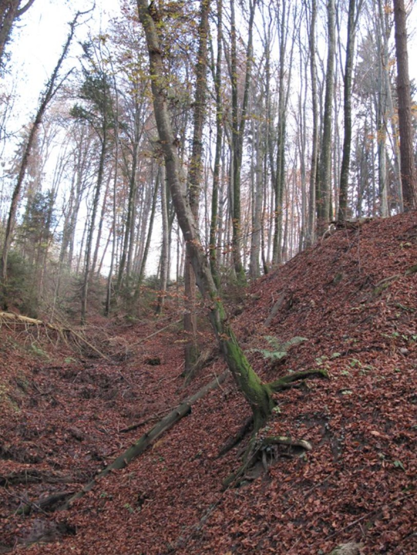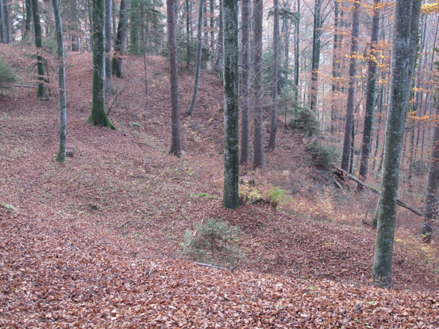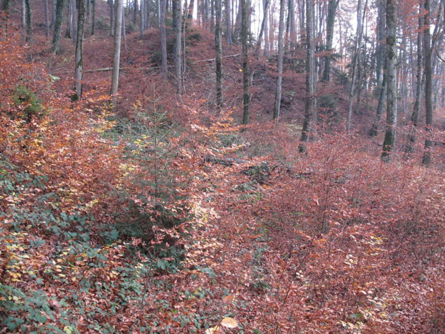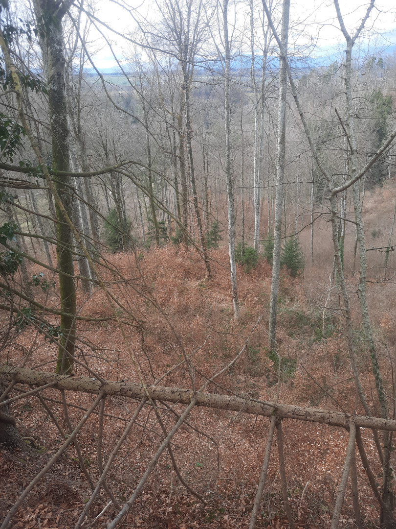 Futaie essentiellement feuillue sur du terrain bosselé. Quelques signes s'instabilité. Présence de petites trouées sur le bas. Le reste est libre de sous-bois.