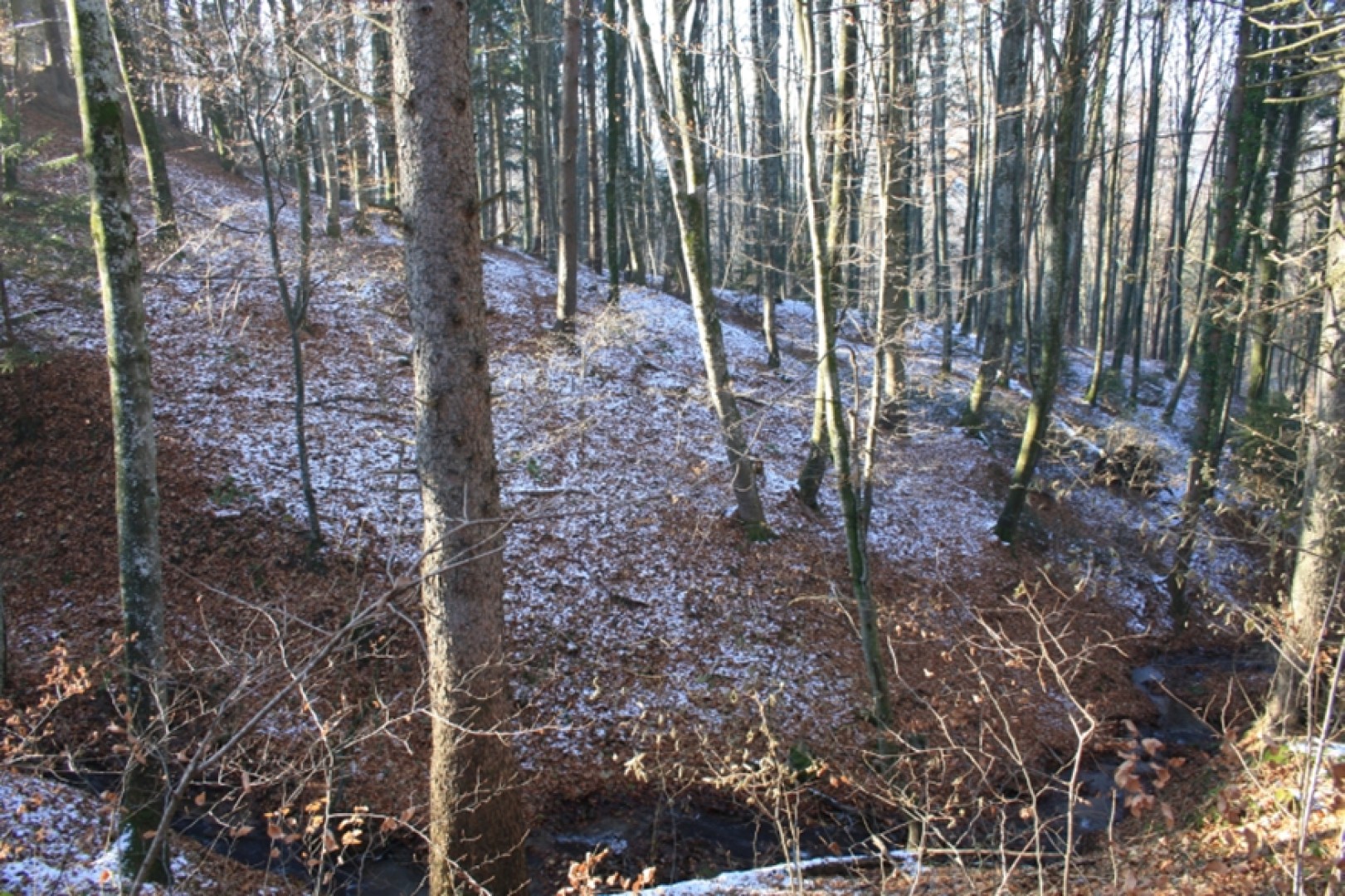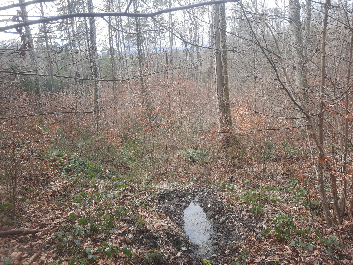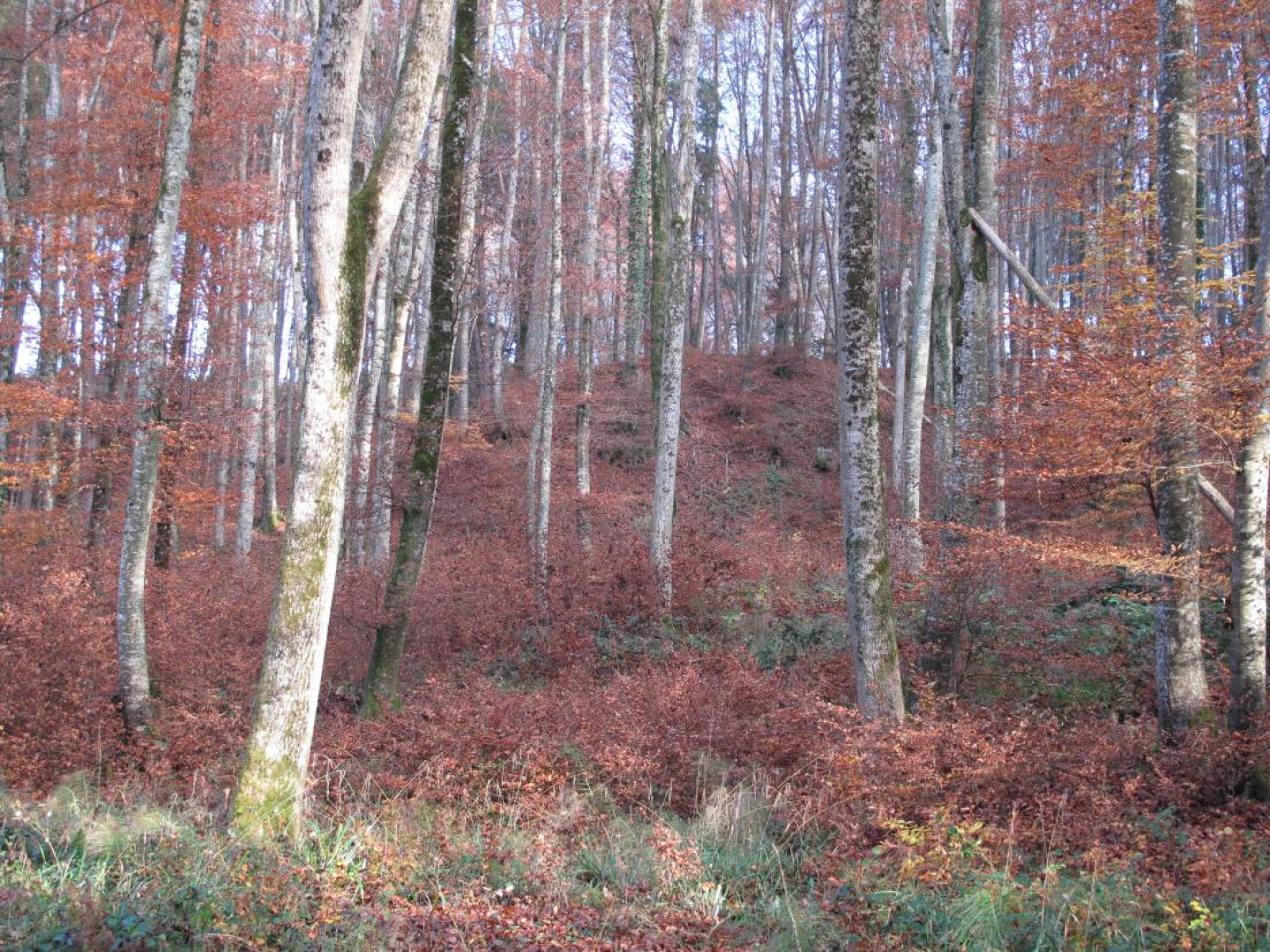 Futaie essentiellement feuillue sur du terrain bosselé. Quelques signes s'instabilité. Présence de petites trouées sur le bas. Le reste est libre de sous-bois.
