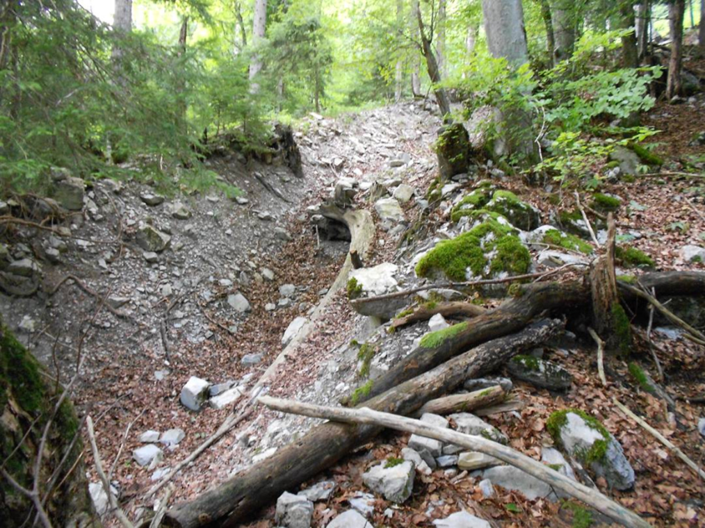Dans une dizaine d'année, la priorité sera de favoriser les feuillus dans le rajeunissement établi. On préconise une mise en lumière qui servira à la fois à maintenir le rajeunissement sur la placette et à régler le mélange pour diminuer la part de résineux. L'intervention pourra être réalisée en agrandissant les trouées déjà existante en créant une ligne de câble. Si celle si est plus large que 20m, il faudra laisser du bois long en travers afin de conserver une protection efficace contre les chutes de pierres.