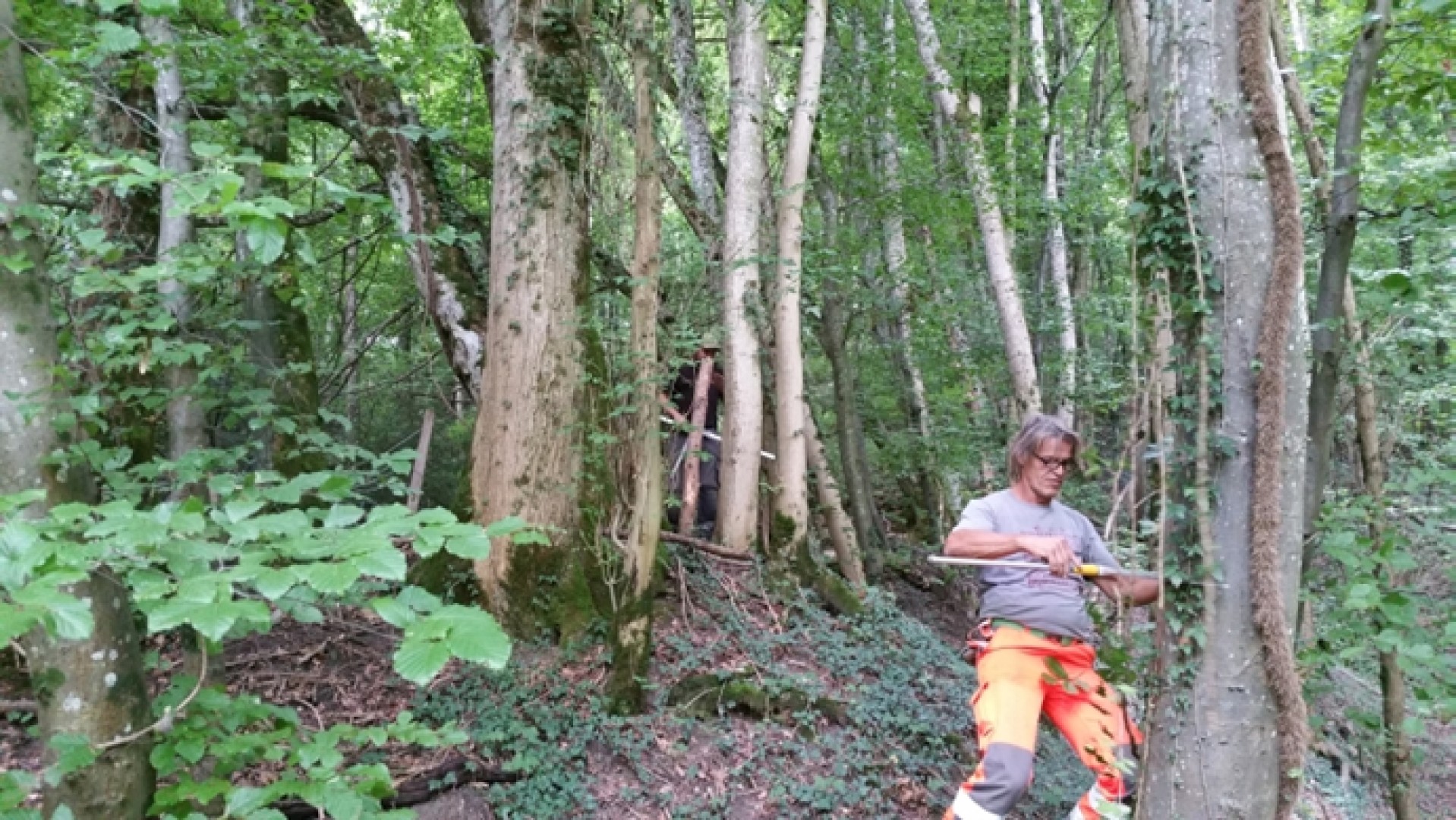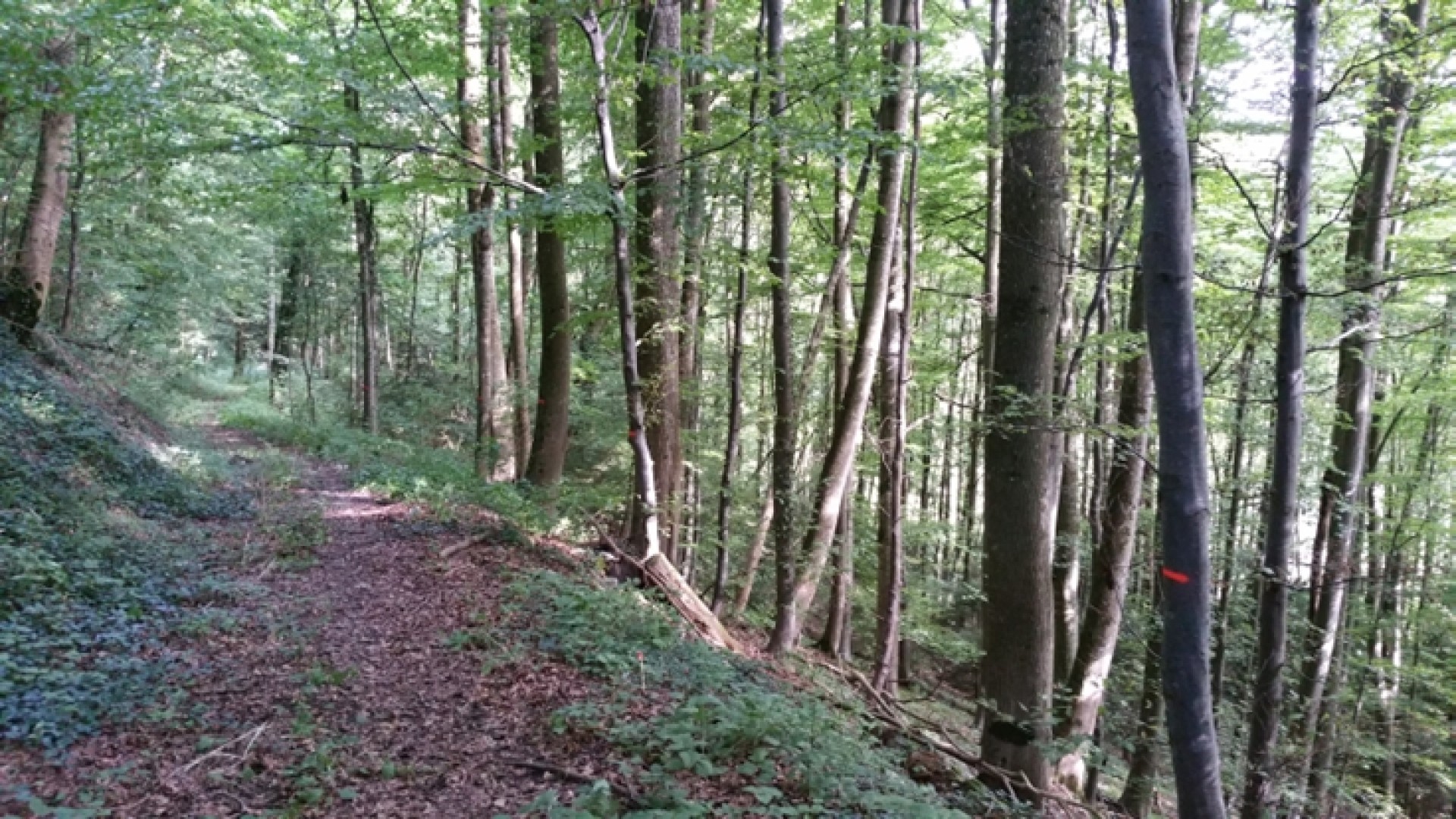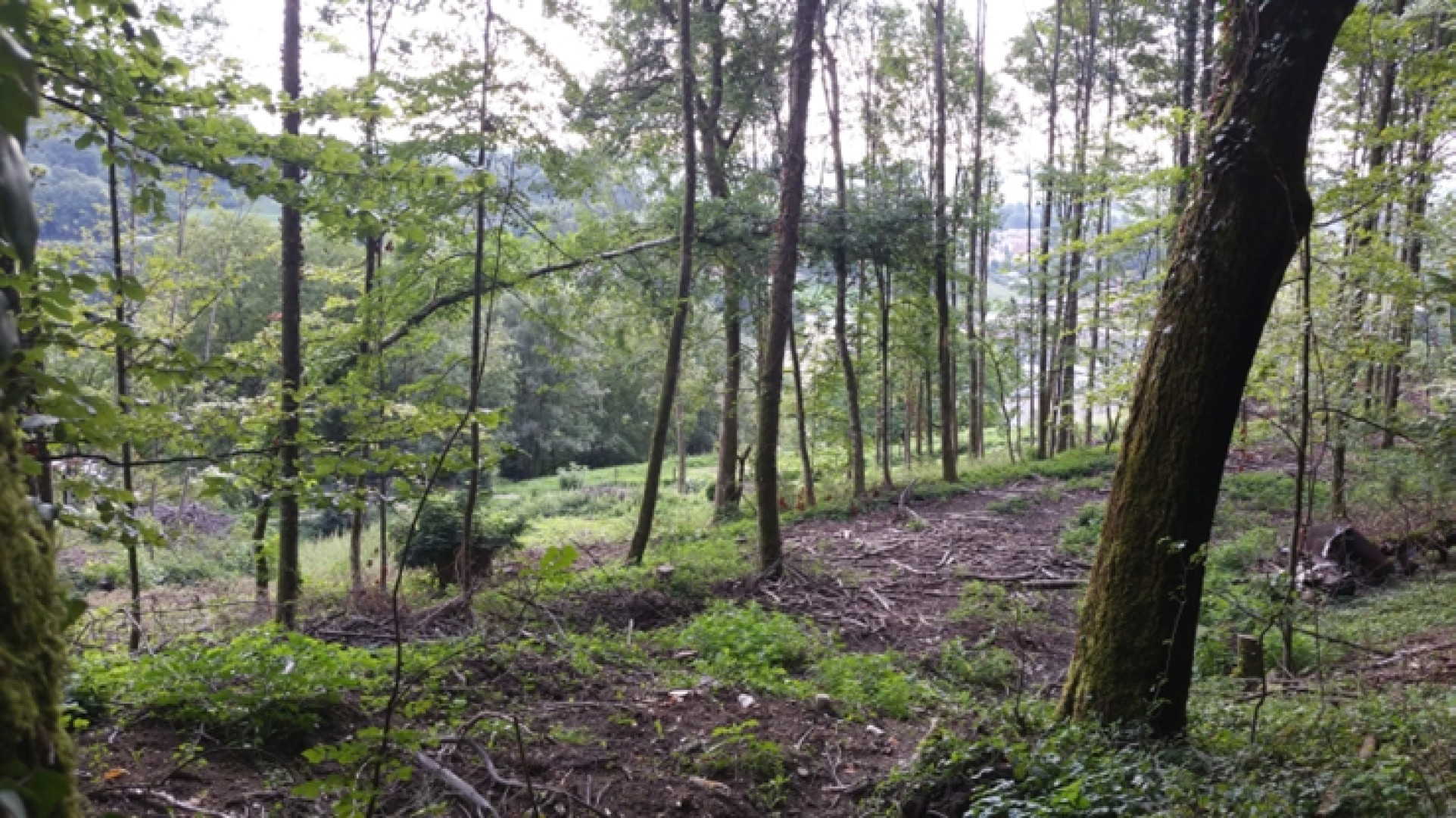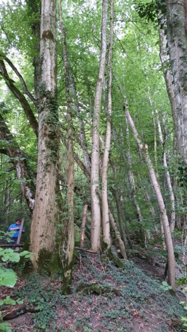 2015 : Installation de la placette. Le peuplement est fermé, composé de vieilles futaies mais égament de zones de jeune futaie (serrée) La moitié du volume de bois sur pied est représenté par le frêne, atteint par la maladie de la Chalarose. L'objectif de cette placette est d'analyser quel est son degré de protection actuel (avec des frênes encore vivants et peu malades) et voir si ce degré de protection diminue avec l'évolution de la maladie.