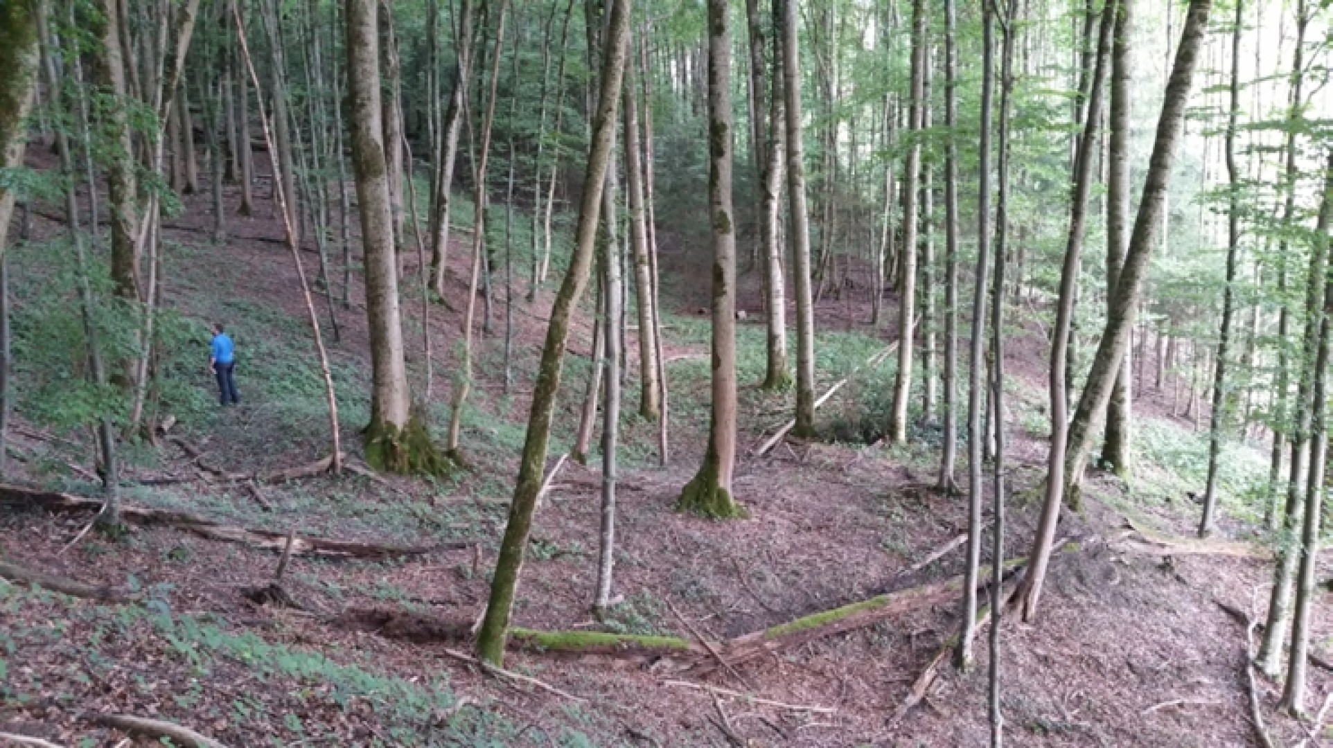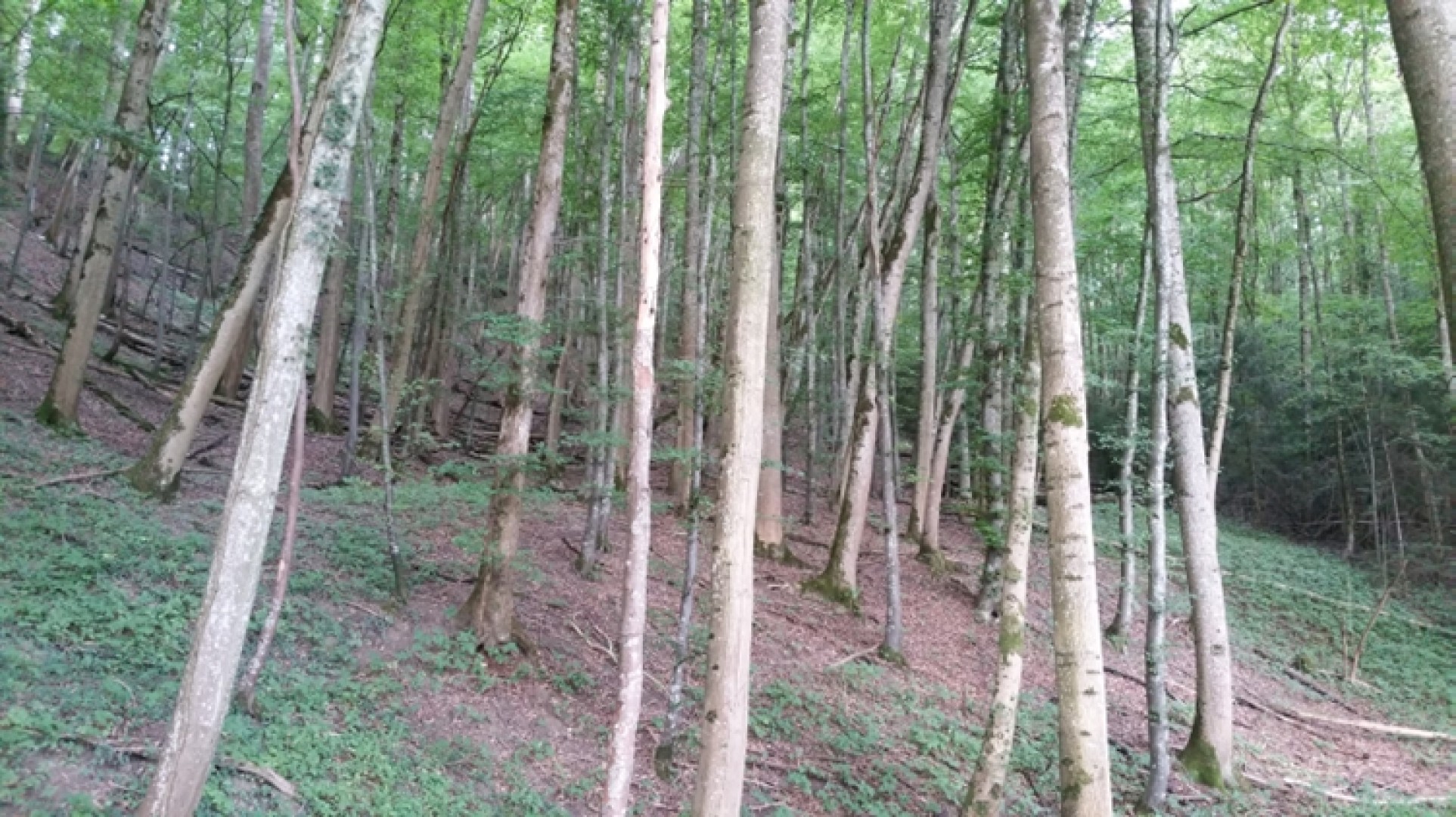 >10% des arbres sont penchés, couronnes asymétrique et étriquées pour toutes les essences; 2 zones d'effondrement importantes, impact de la chalarose sur les frêne moins dominant qu'attendu
