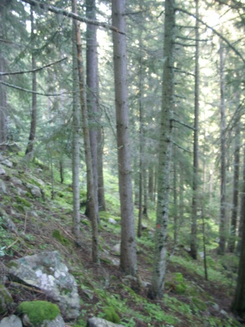 Pessière haut-montagnarde représentative de l'Entremont. Zone de danger de chutes de blocs.
