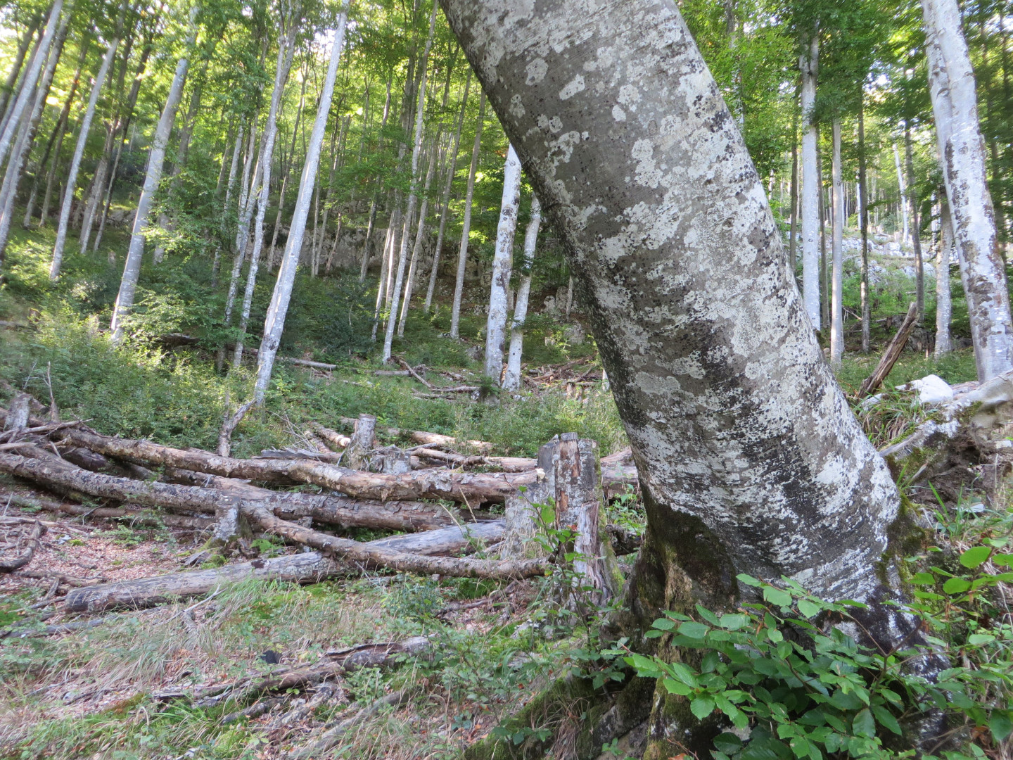 unterster Drittel: nur Durchforstung; Bu haben reagiert und Kronendach wieder geschlossen; Keimlinge und Anwuchs vorhanden; heute zu wenig Licht für Aufwuchs