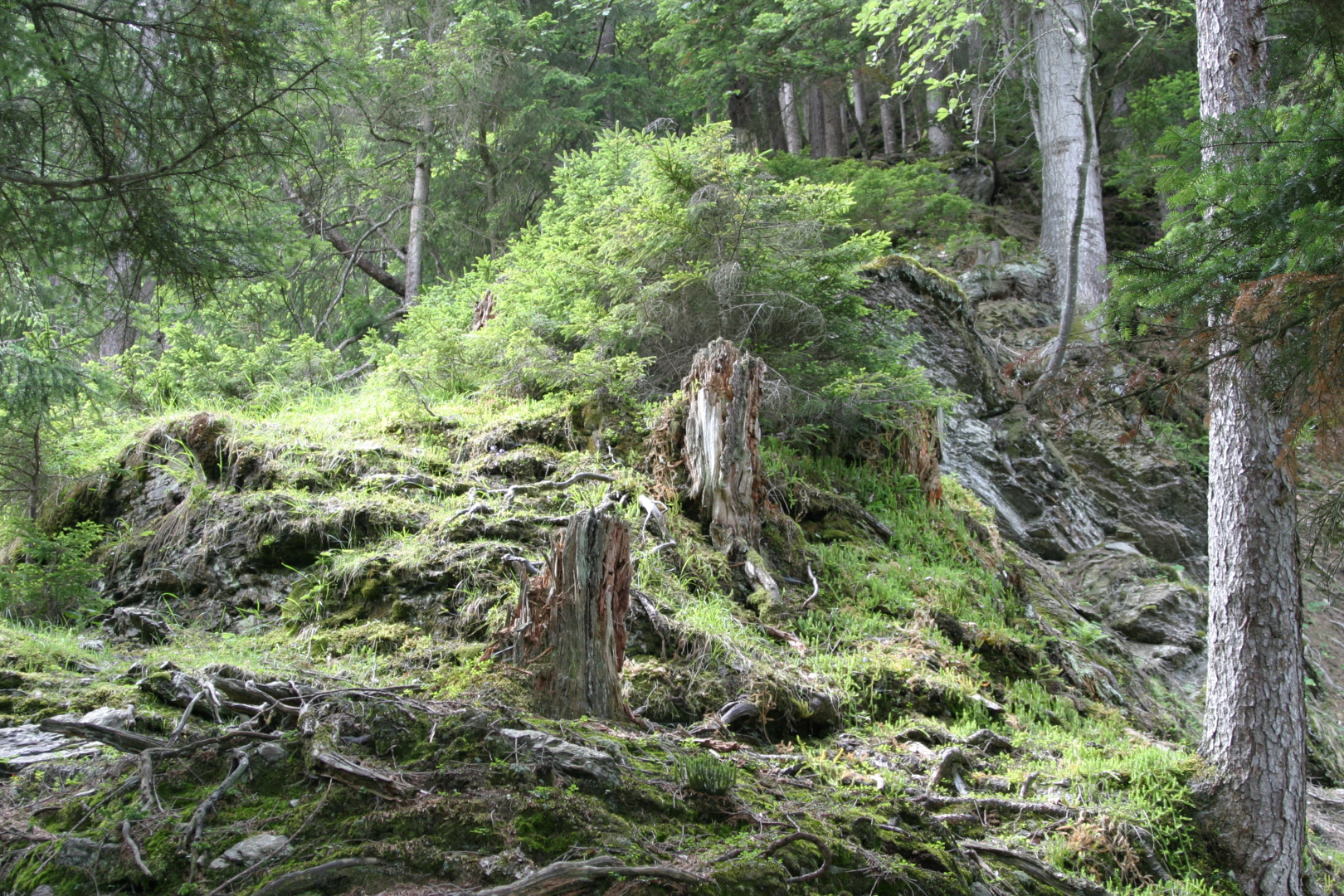 Stein- und Eisschlag entlang den Bächen -> Fichte Rotfäule