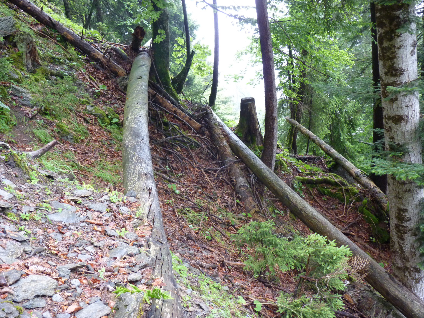 Dank Querbäumen kann die Einleitung der Verjüngung ohne Verringerung des Schutzdefizites erfolgen. Gemäss Zeichen im Bestand ist der Steinschlag nicht sehr aktiv in diesem Gebiet.