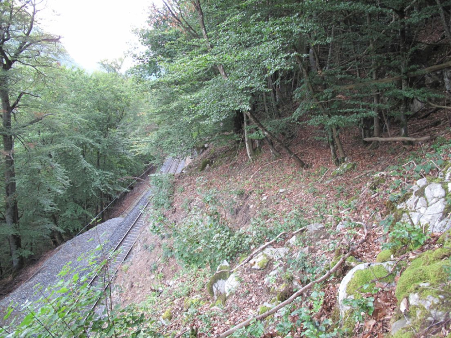 2014 : Coupe le long de la ligne de chemin de fer. Depuis la rupture de pente, coupe forte pour sécuriser la voie. Elimination des arbres penchés, prélèvement de 50% environ.