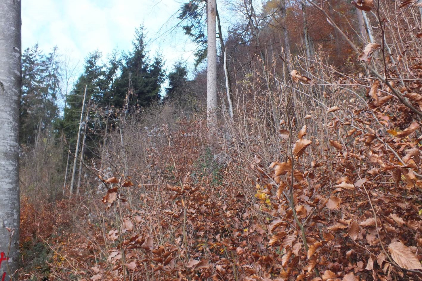 Stammzahl hat sich aufgrund des Holzschlages stark reduziert. Mit Querbäumen wurde Schutzdefizit möglichst ausgeglichen. Jedoch waren auf diesem Standort keine temporären Schutzmassnahmen notwendig, da die Steinschlagaktivität als gering beurteilt werden kann. Hinsichtlich der Schutzwirkung wäre eine Etappierung des Holzschlages sinnvoll gewesen (Unterteilung des Perimeters in 2 Streifen).