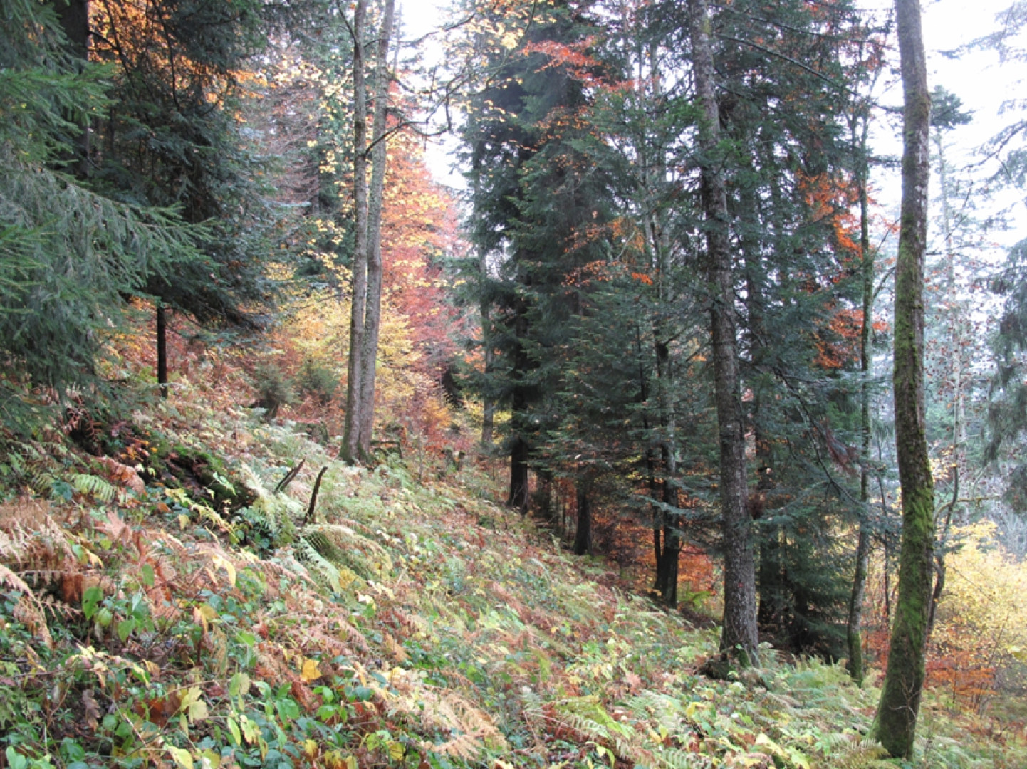 Mélange: majoritairement du sapin (70%), accompagné d'épicéa (10-15%) et de hêtre (5-10%). Le rest du peuplement est composé d'érable et de frêne, avec un présence de saule, sureau, sorbier des oiseleurs