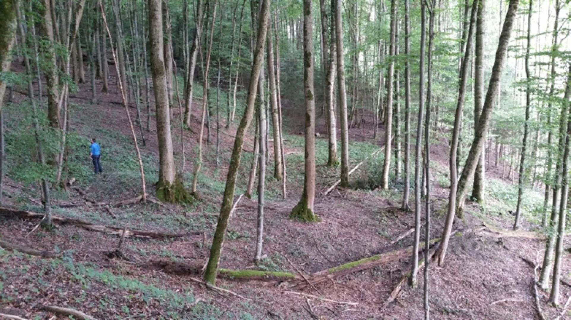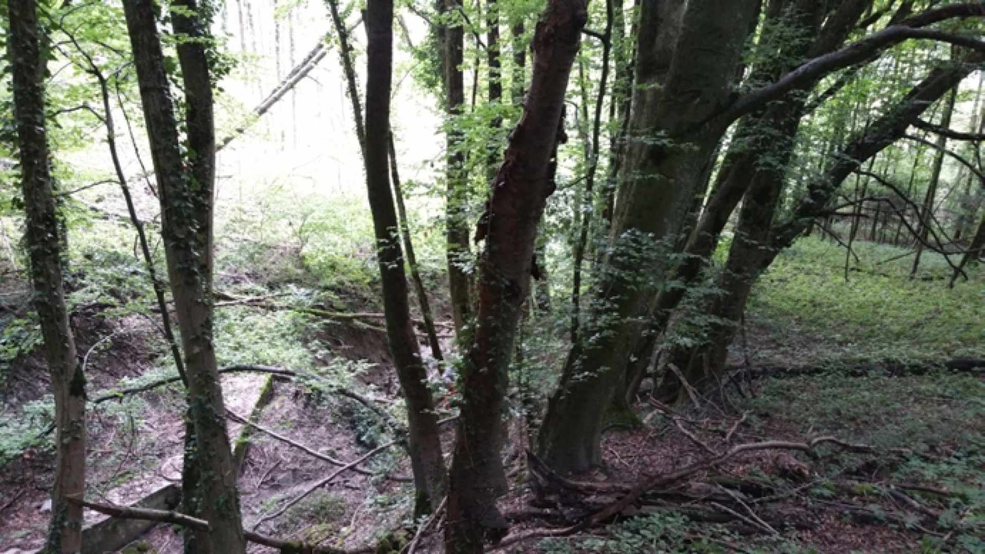 2015 : Installation de la placette. Le peuplement est fermé, composé de vieilles futaies mais égament de zones de jeune futaie (serrée) La moitié du volume de bois sur pied est représenté par le frêne, atteint par la maladie de la Chalarose. L'objectif de cette placette est d'analyser quel est son degré de protection actuel (avec des frênes encore vivants et peu malades) et voir si ce degré de protection diminue avec l'évolution de la maladie.