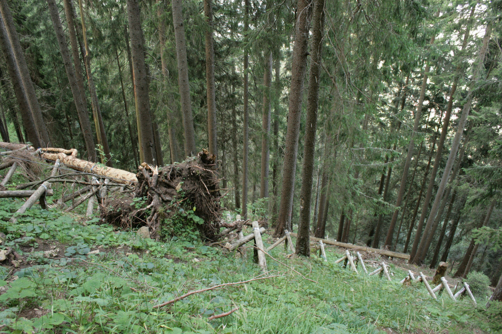 Verjüngung: Keine Ansamung feststellbar, Moderholz noch zu jung, Wildeinfluss an Weichhölzern deutlich sichtbar, Ansamung an verj. günstigen Stellen fehlt (Wild?), Was geschieht mit Pflanzen die aus Tok herauswachsen? Wildfrage schwierig zu beurteilen.
